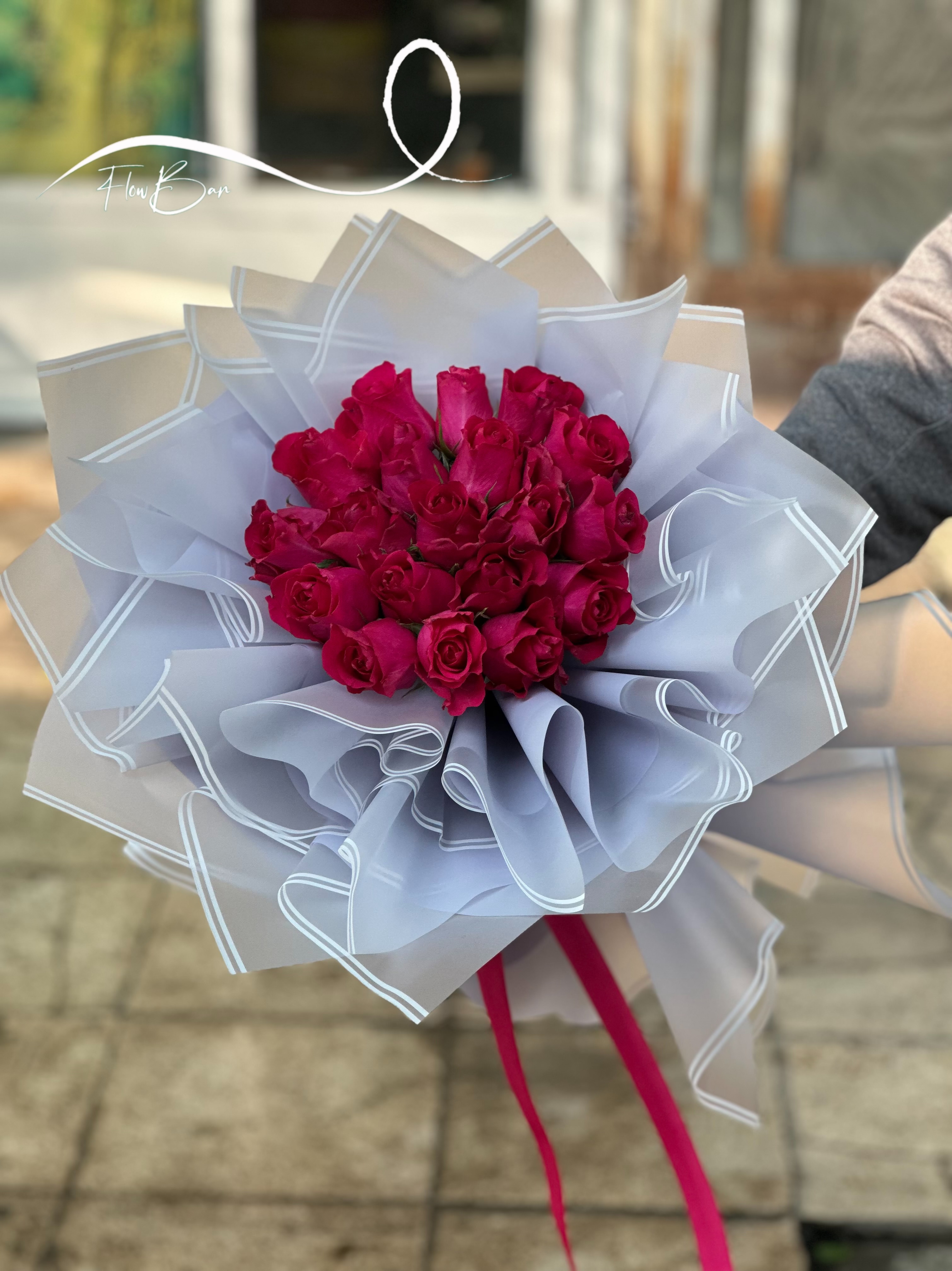 دسته گل ۲۰ شاخه رز سرخابی فلوبار