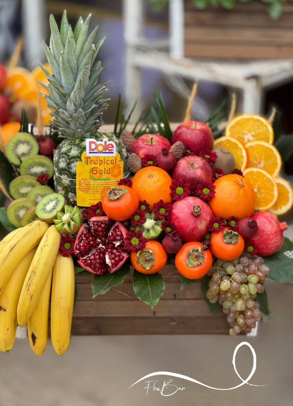 شامل: آناناس، موز، انار، سیب، پرتقال، کیوی، خرمالو، انگور، انار خشک، کاج به همراه گل آرایی