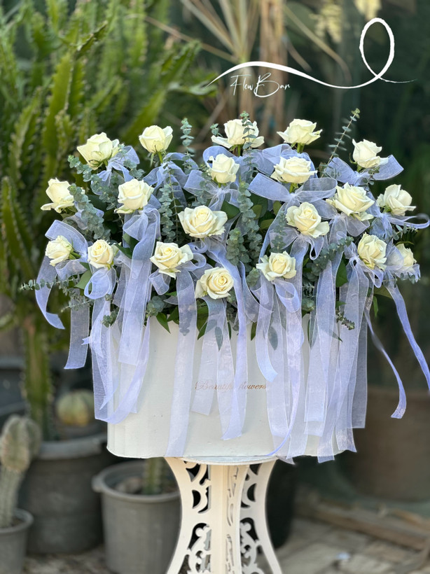 این باکس گل با رنگهای سفید و گلبهی، حس لطافت، عشق و احترام را منتقل میکند و انتخابی عالی برای مراسمهای عاشقانه، رسمی و خانوادگی است.