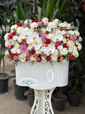 این باکس گل با رنگهای سفید و گلبهی، حس لطافت، عشق و احترام را منتقل میکند و انتخابی عالی برای مراسمهای عاشقانه، رسمی و خانوادگی است.