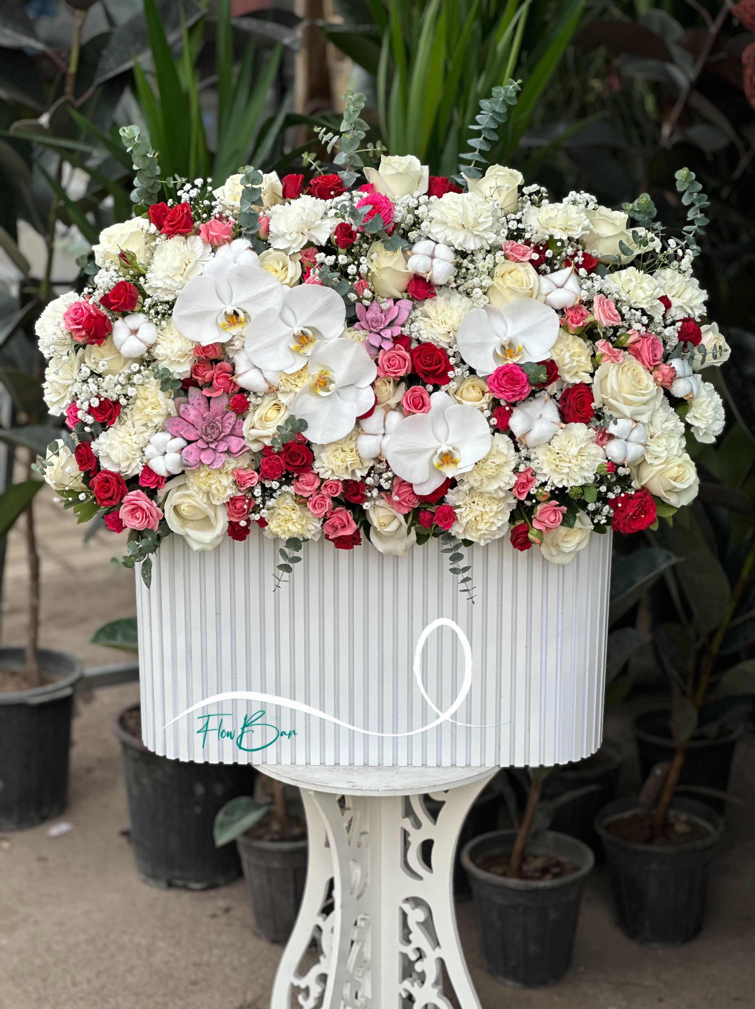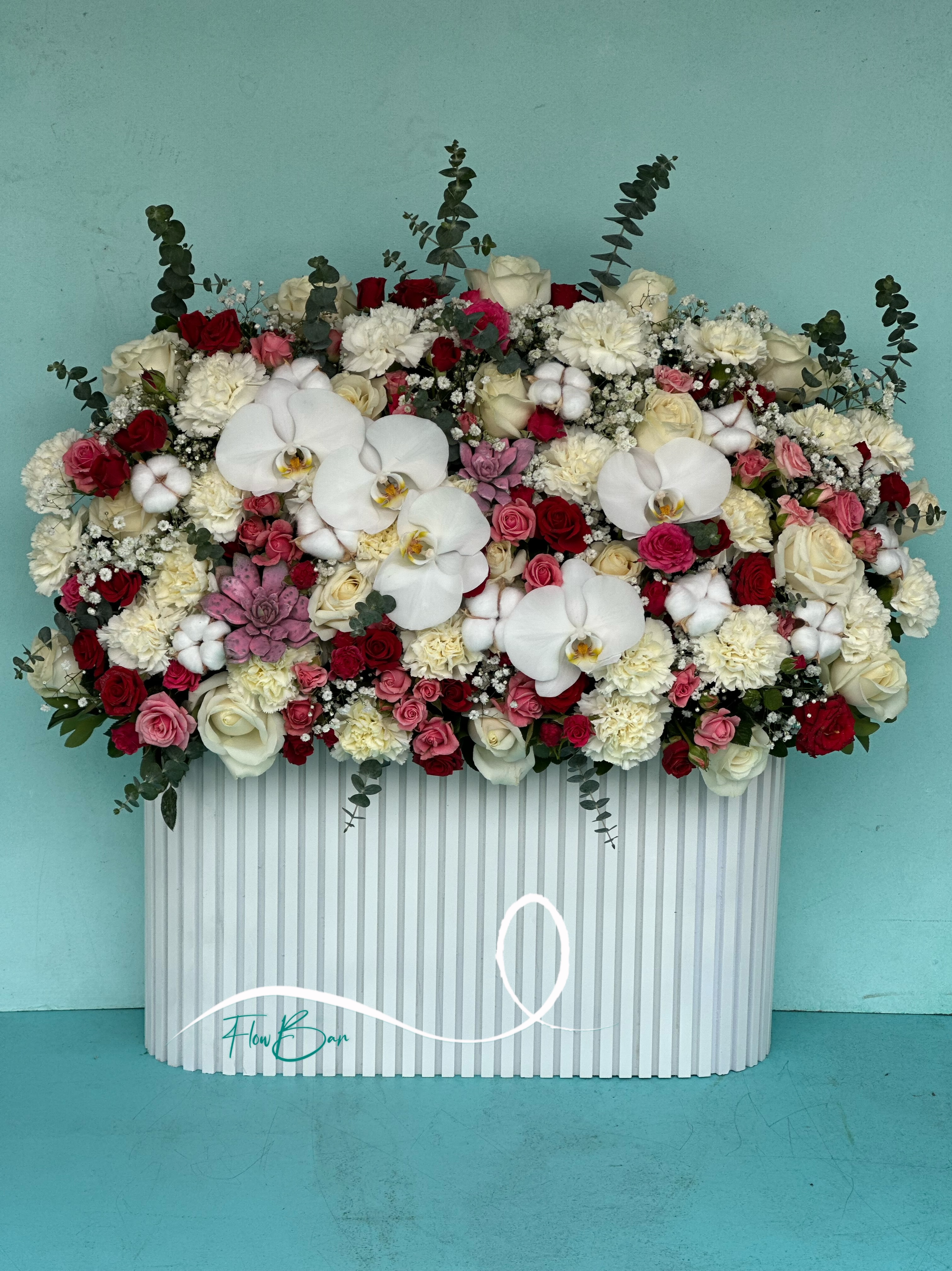 این باکس گل با رنگهای سفید و گلبهی، حس لطافت، عشق و احترام را منتقل میکند و انتخابی عالی برای مراسمهای عاشقانه، رسمی و خانوادگی است.