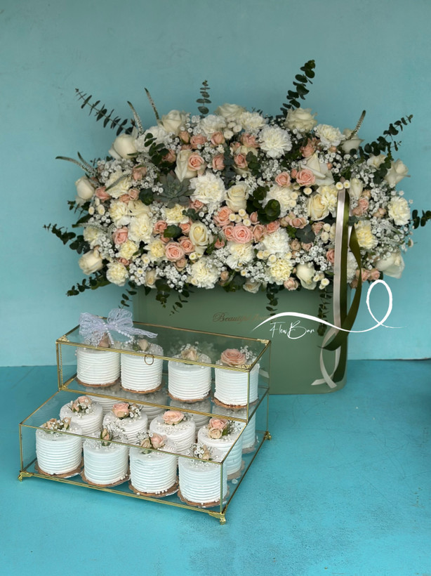 باکس گل و کاپ کیک خواستگاری سبز و گلبهی فلوبار