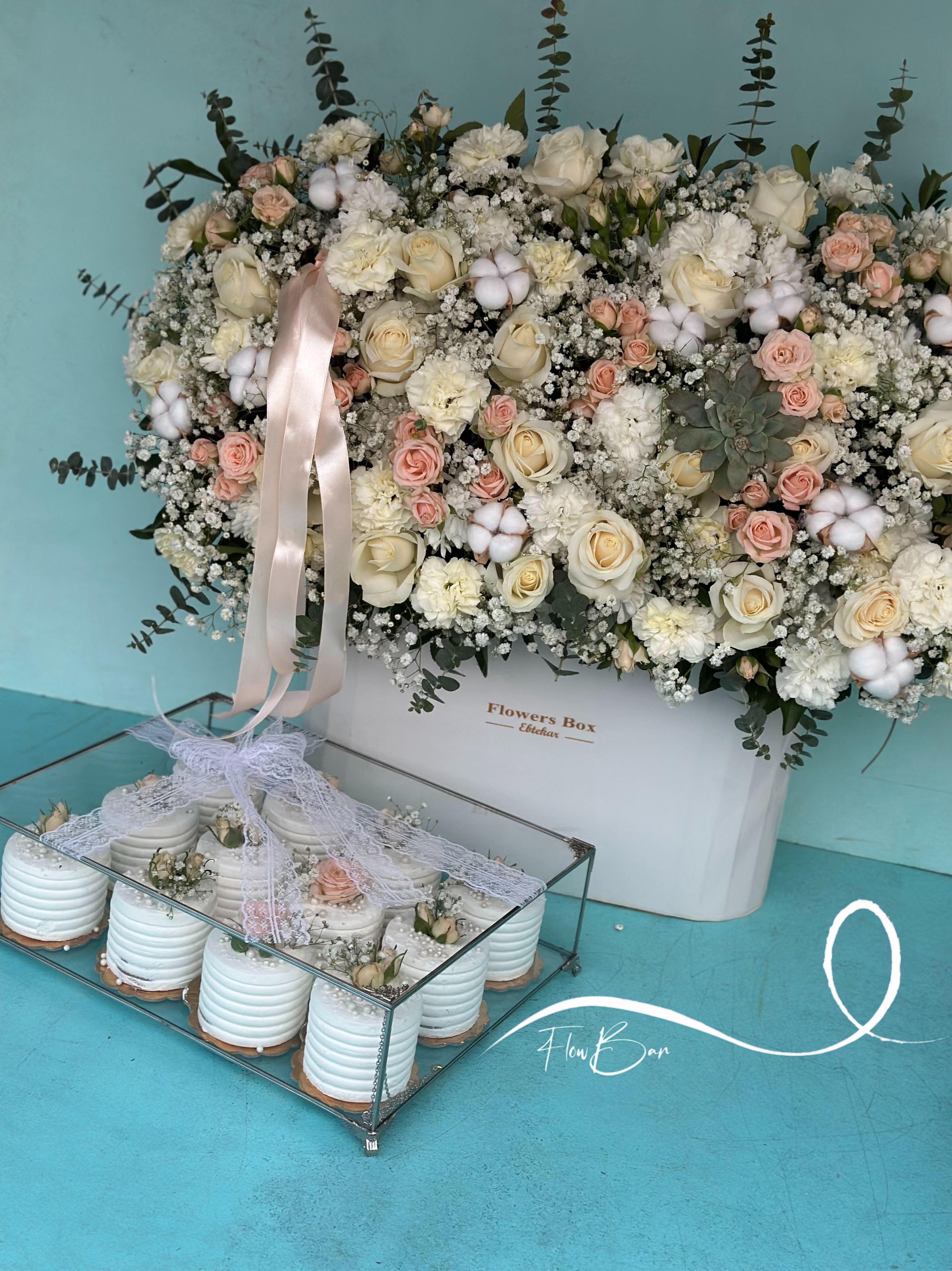 باکس گل و کاپ کیک خواستگاری سفید و گلبهی فلوبار