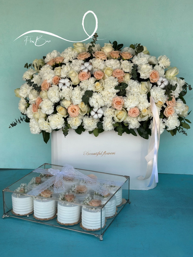 باکس گل و کاپ کیک خواستگاری سفید و گلبهی فلوبار