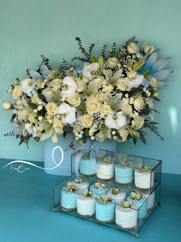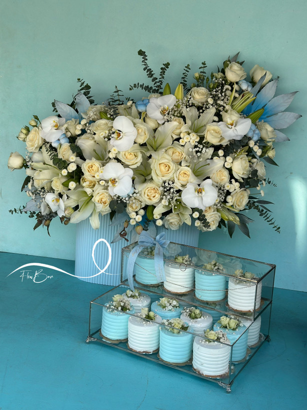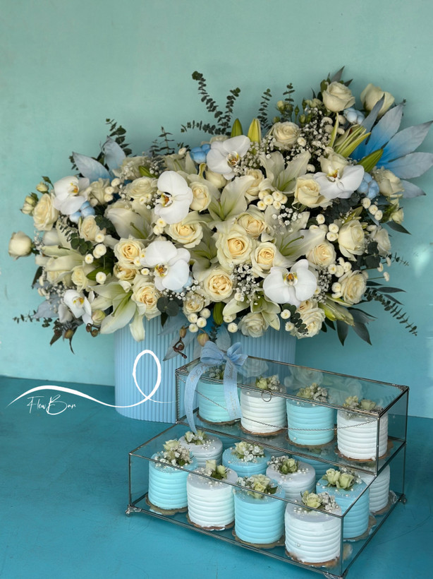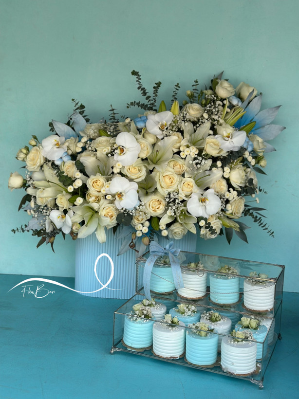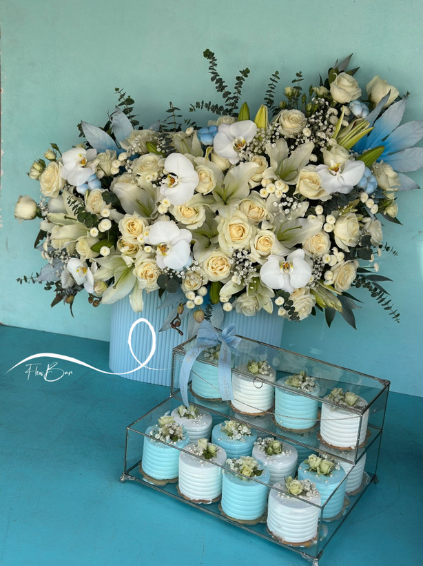 باکس گل و کاپ کیک خواستگاری سفید آبی فلوبار
