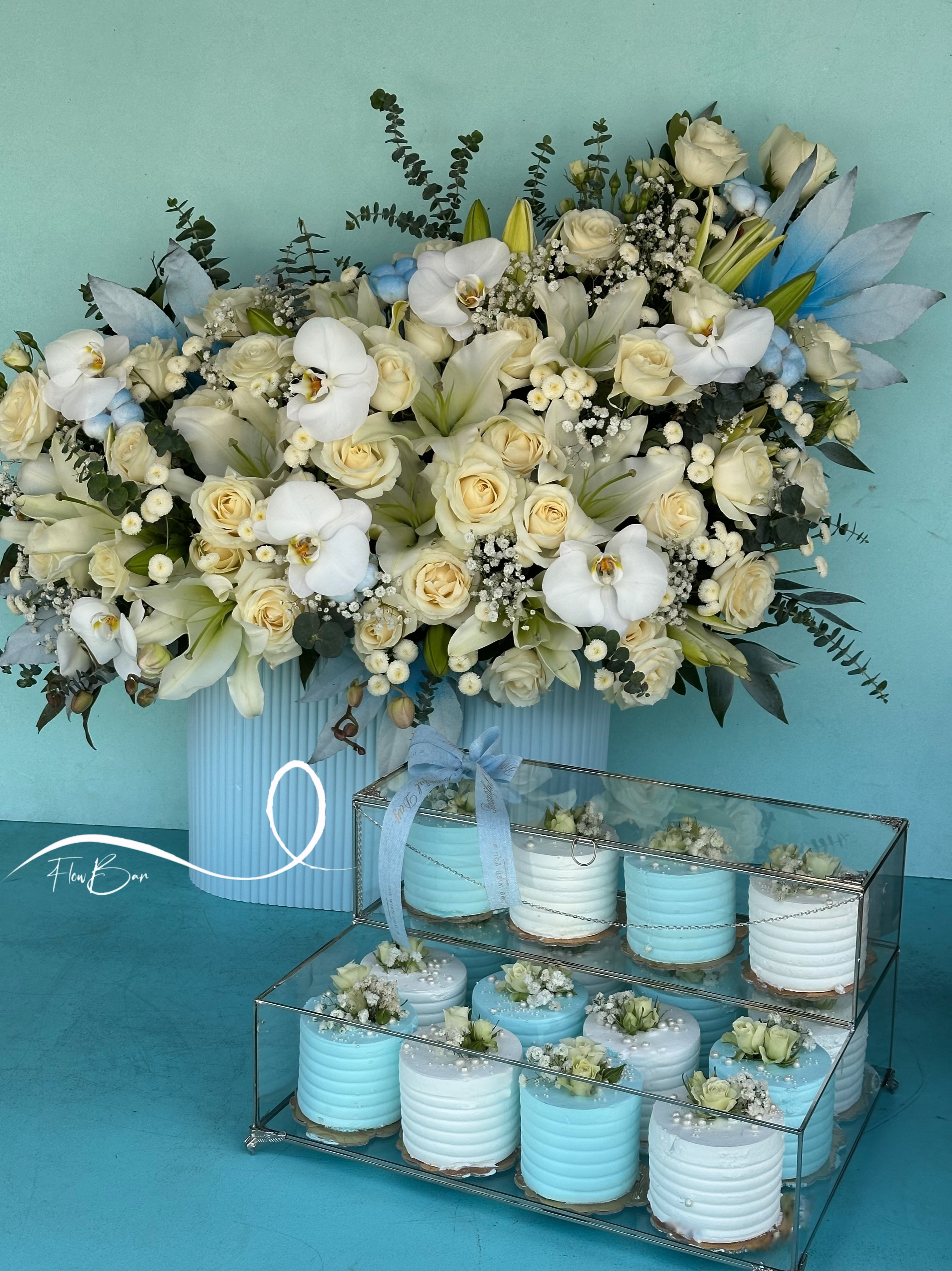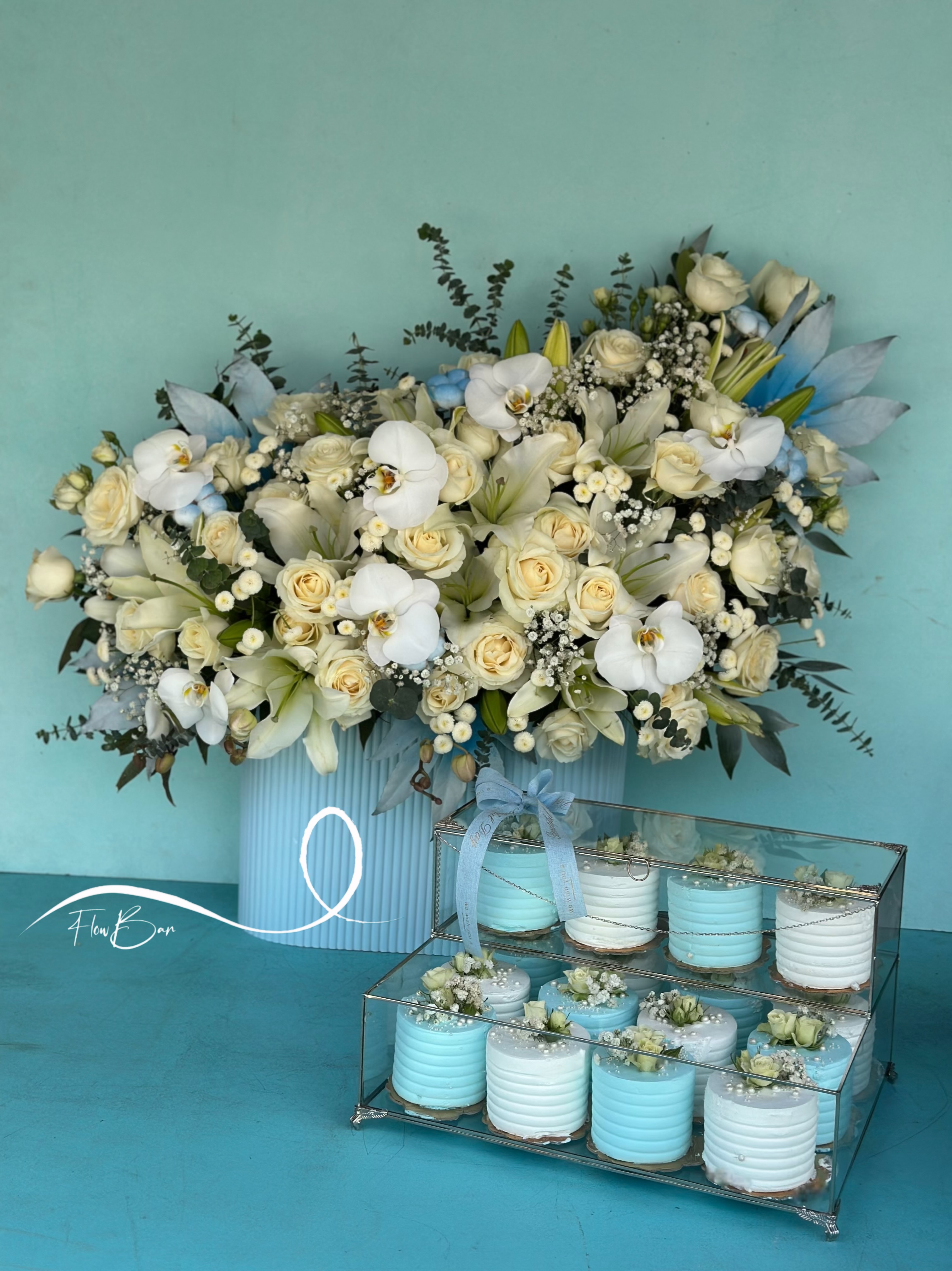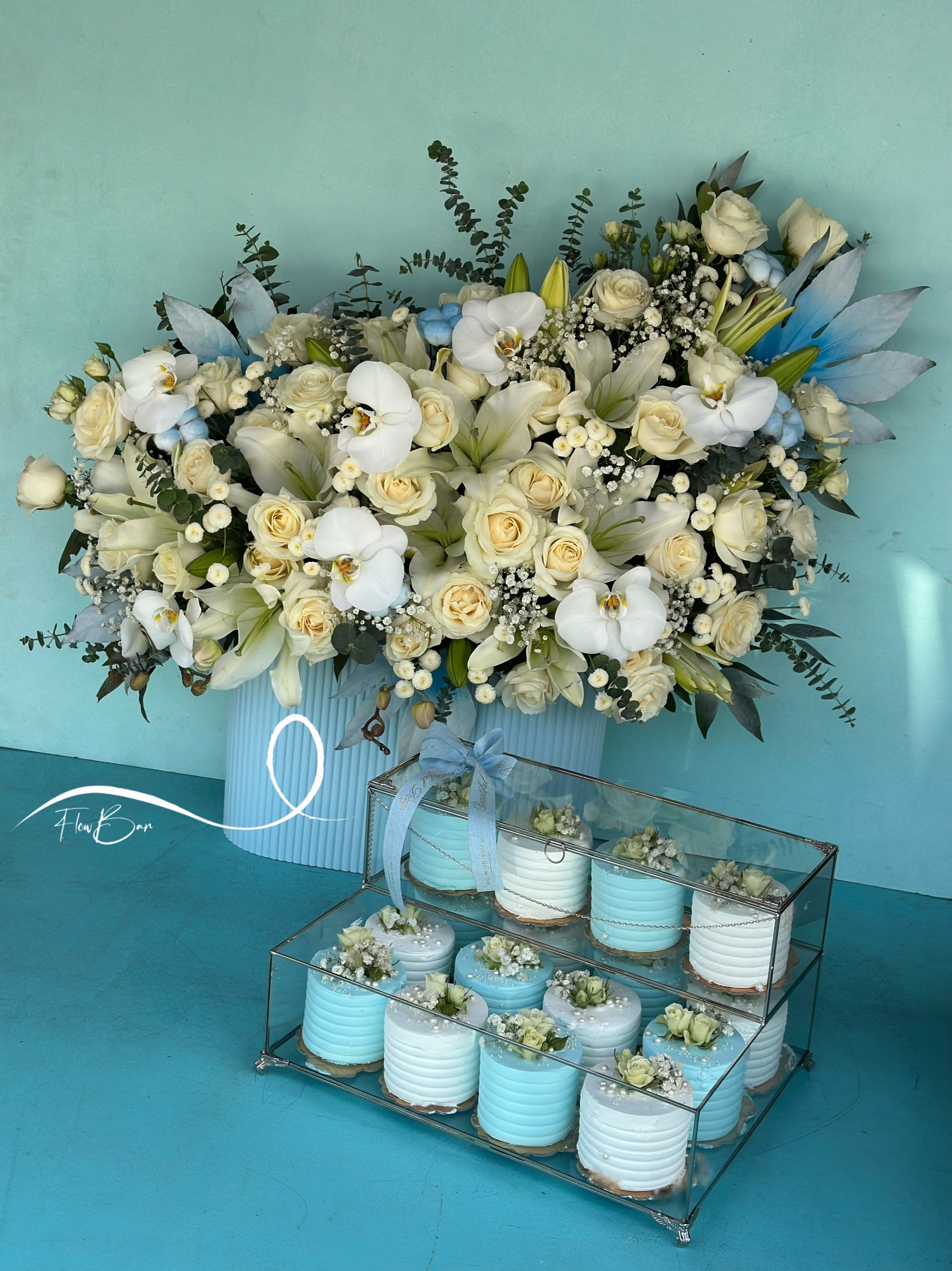 باکس گل و کاپ کیک خواستگاری سفید آبی فلوبار