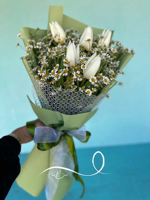 دسته گل لاله سفید و بابونه فلوبار