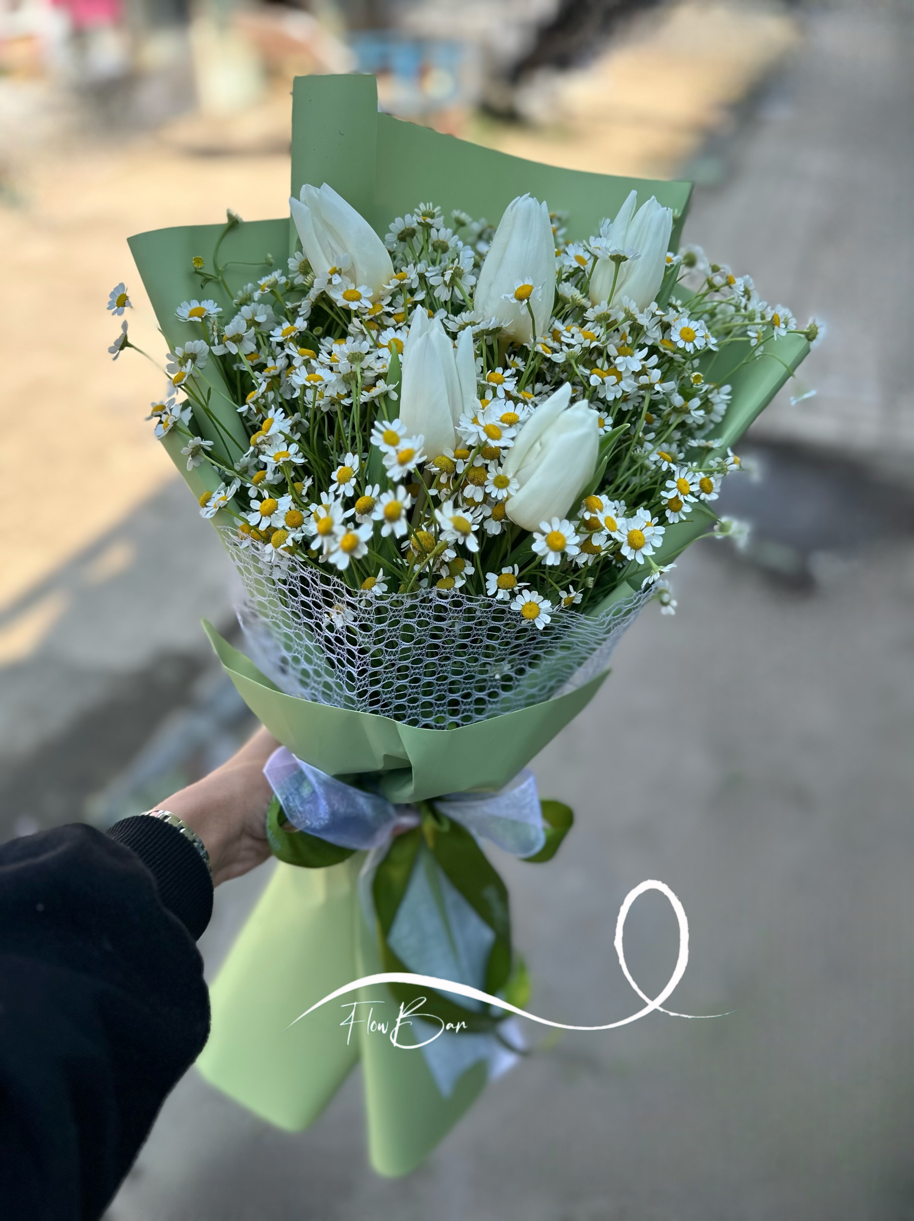 دسته گل لاله سفید و بابونه فلوبار