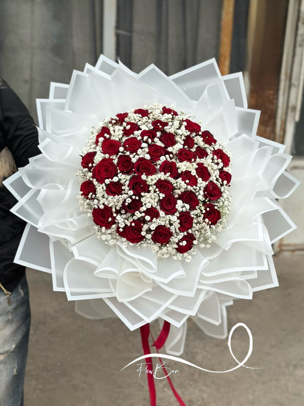 دسته گل ۴۰ شاخه رز قرمز به همراه ژیپسوفیلا❤️🤍