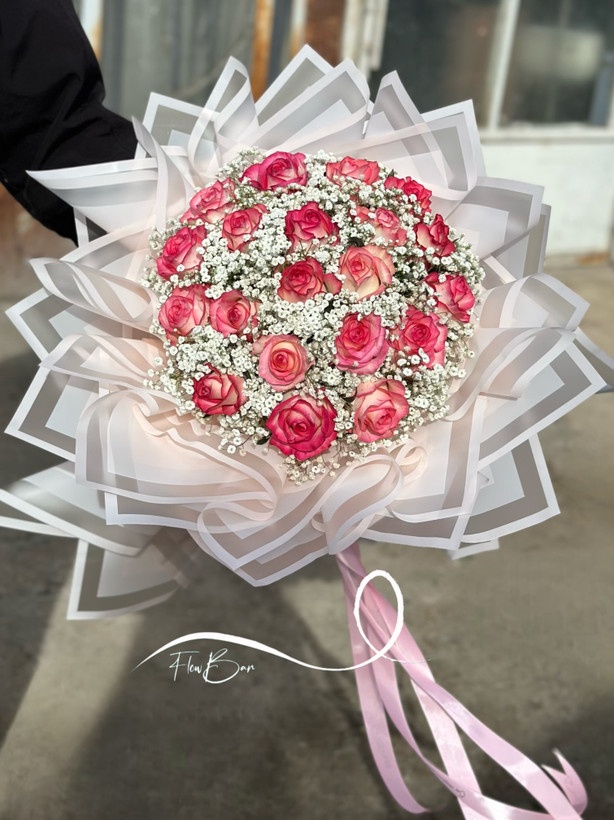 دسته گل ۲۰ شاخه رز جومیلیا به همراه ژیپسوفیلا🩷🤍