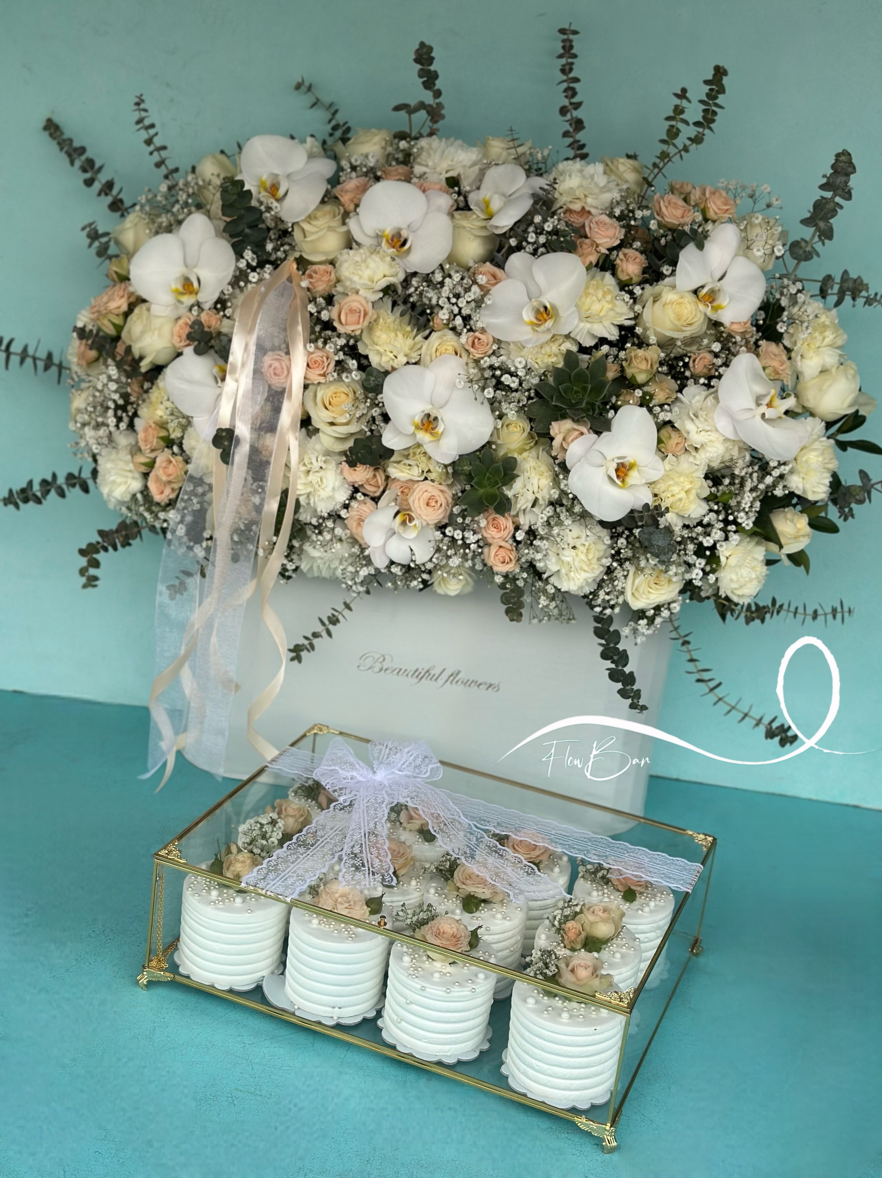 باکس گل و کاپ کیک خواستگاری سفید و گلبهی فلوبار