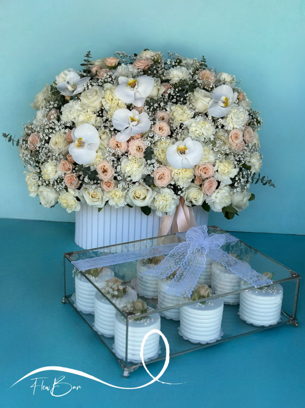 باکس گل و کاپ کیک خواستگاری سفید و گلبهی فلوبار