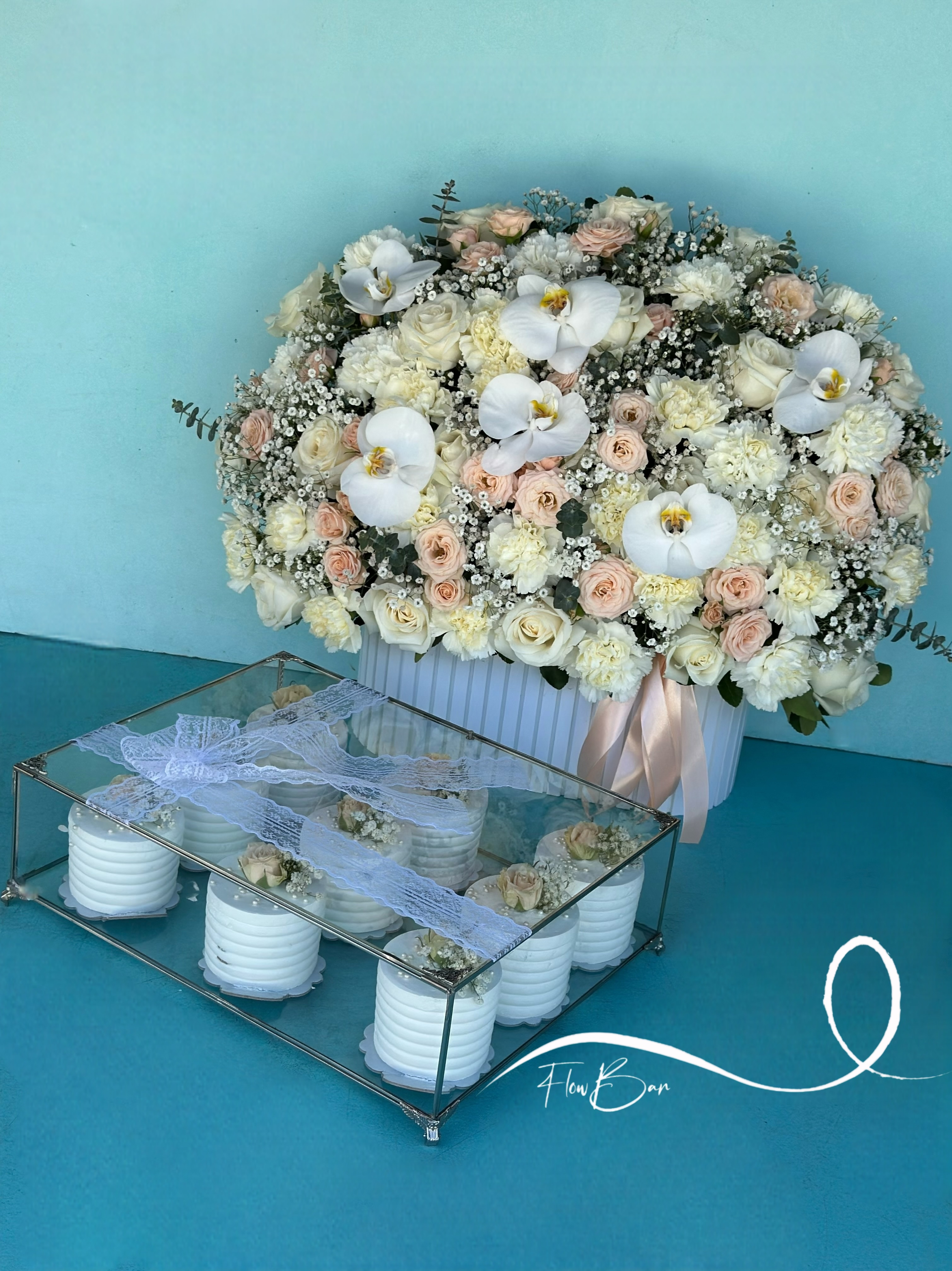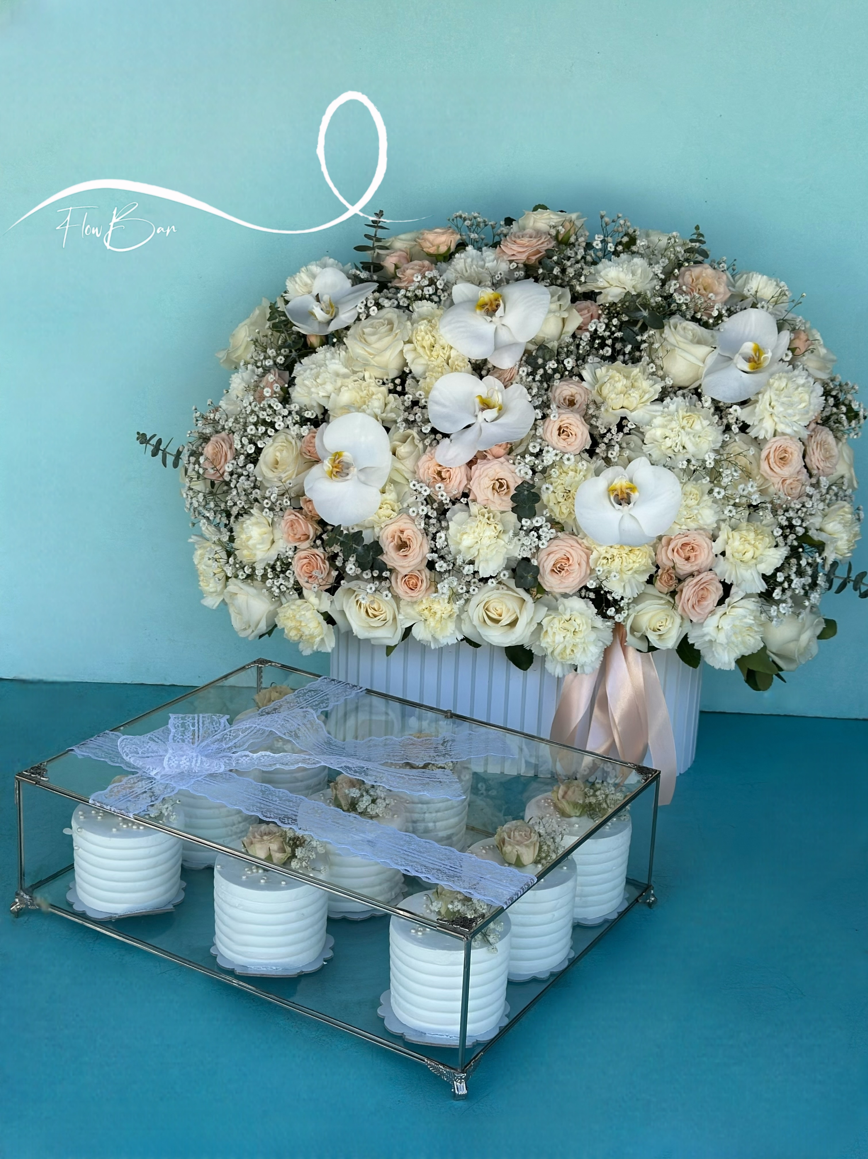 باکس گل و کاپ کیک خواستگاری سفید و گلبهی فلوبار