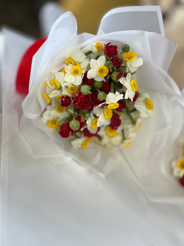 دسته گل کوچک نرگس با رز مینیاتوری❤️💛