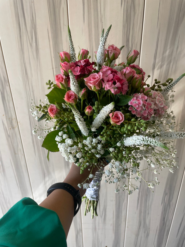 ترکیبی از گلهای رز مینیاتوری، ورونیکا، قلمفور و ژیپسوفیلا✨
