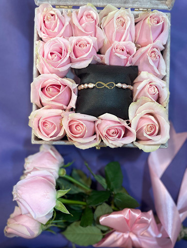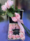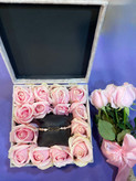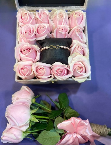 باکس گل در دار سفید با ۱۵ شاخه گل رز هلندی صورتی🌸 به همراه یک دسته گل رز ۵ شاخه✨