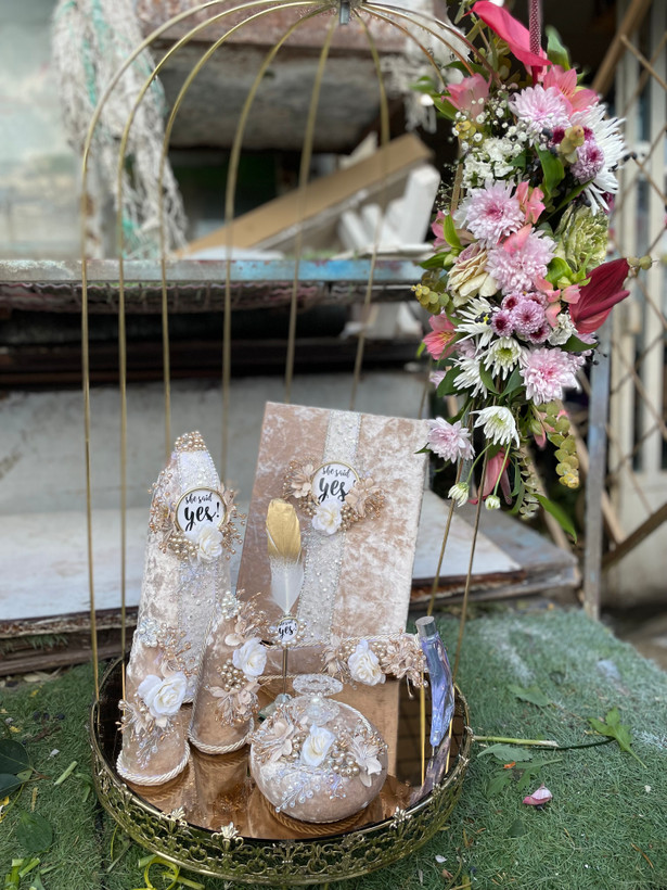 ست عقد شامل دفتر بله برون، قلم، قندشکن، کله قند، قندساب و جای حلقه هست