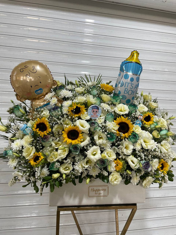 باکس گل نوزادی پسرونه با گلهای رز، آفتابگردون، لیسینتوس، داودی و ژیپسوفیلا🤩