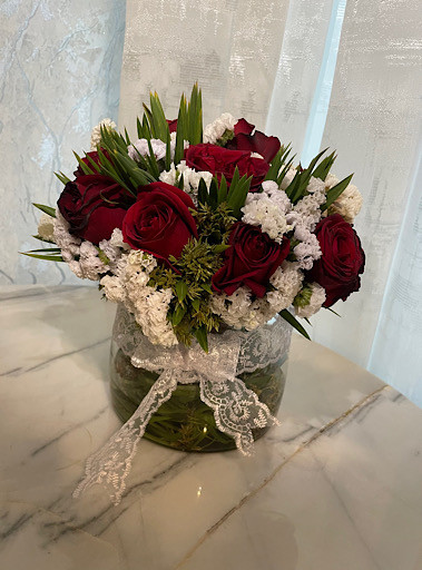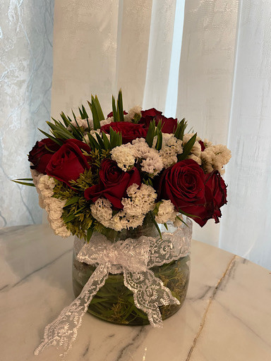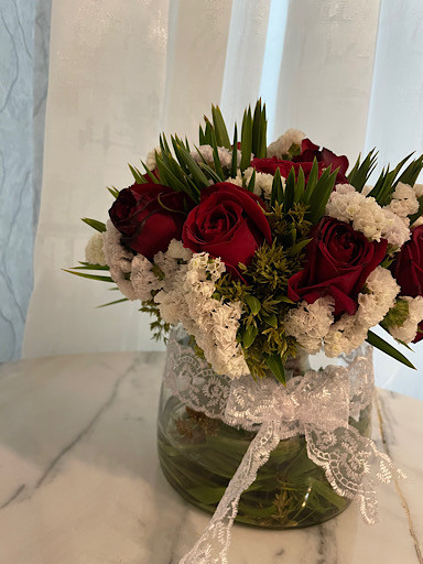 جار گل رز قرمز ترکیب با گل زنبوری سفید و برگ🌹