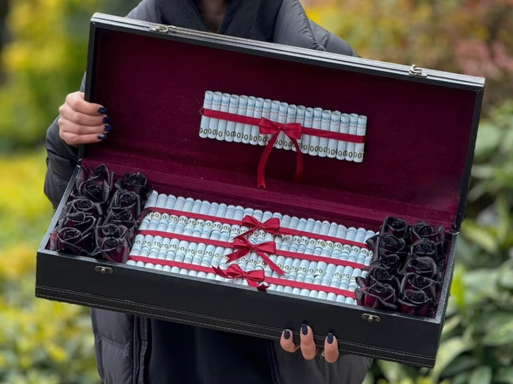 پول آرایی داخل باکس به همراه ۲۰ شاخه گل رز بلک 🖤❤️💵