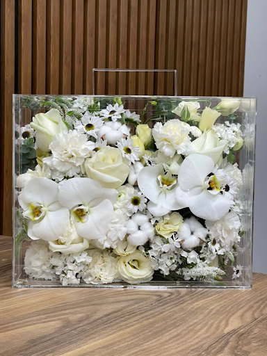 ترکیب گلهای رز، رز مینیاتوری، میخک، داودی کرزنتیا، قلمفور، ورونیکا، ارکیده و پنبه🤍