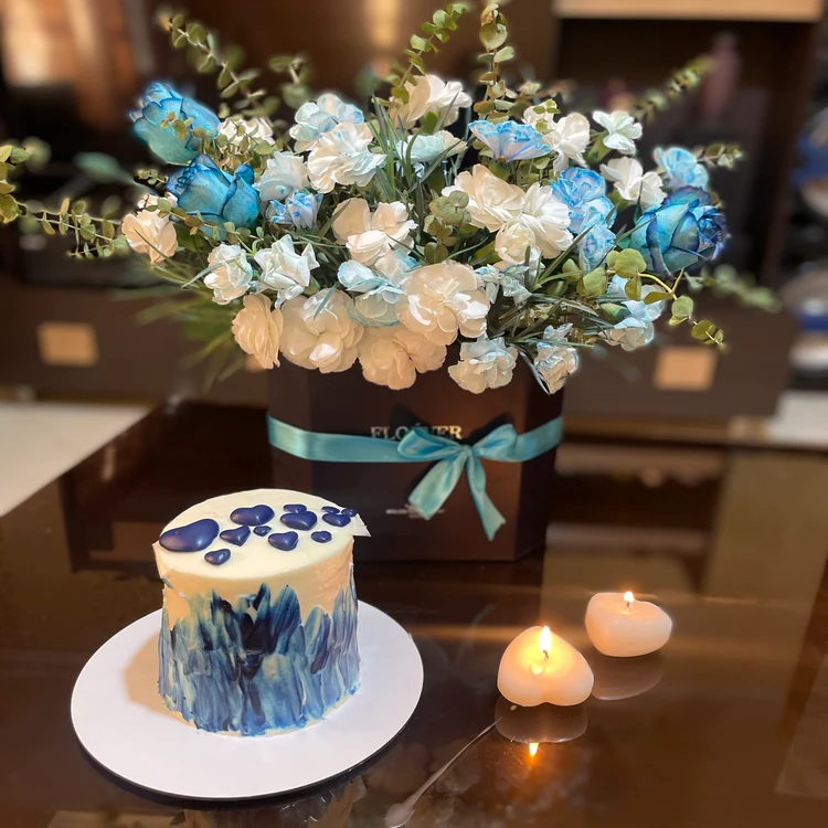 پک گل و کیک تولد با تم سرمه ای مردونه💙