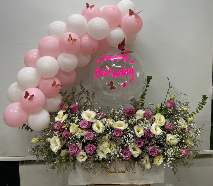 ترکیب باکس گل صورتی جذاب با بادکنک🌸