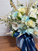 گل رز و لیسینتوس آبی داخل جار گل فلوبار
