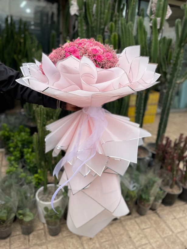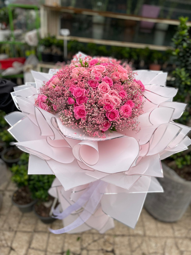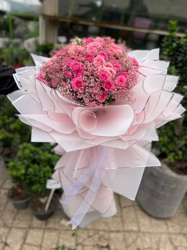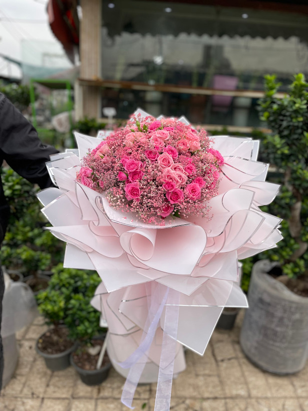دسته گل ژیپسوفیلا و رز مینیاتوری🩷