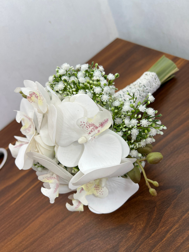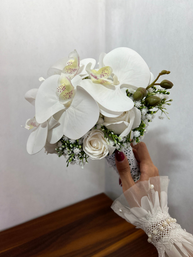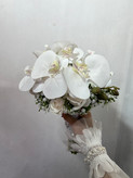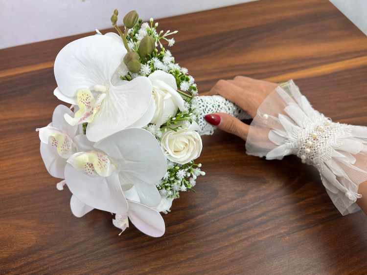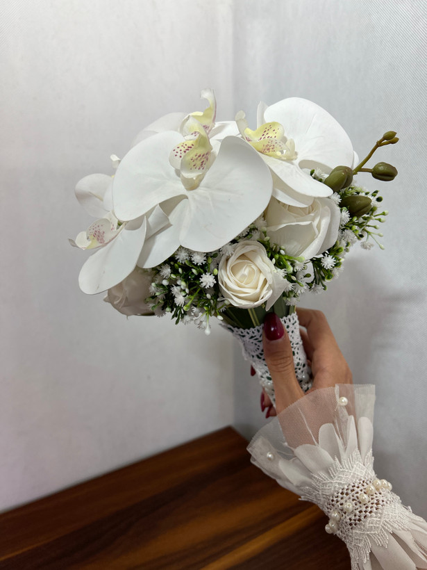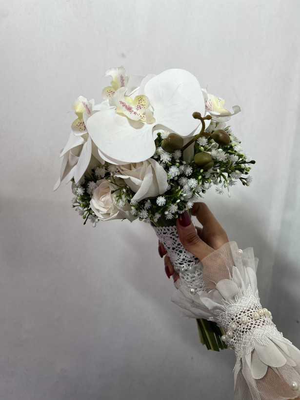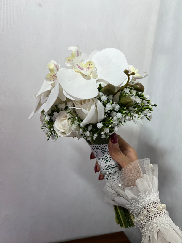 دسته گل عروس با رز، ارکیده و ژیپسوفیلا مصنوعی