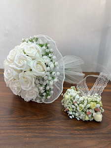 دسته گل عروس با رز و ژیپسوفیلا مصنوعی😍