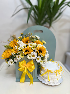 باکس گل و کیک تولد با تم آفتابگردون فلوبار