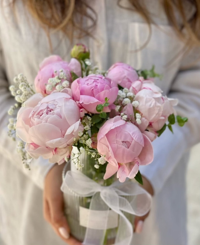 گل پیونی و ژیپسوفیلا داخل جار گل فلوبار