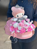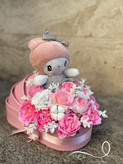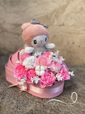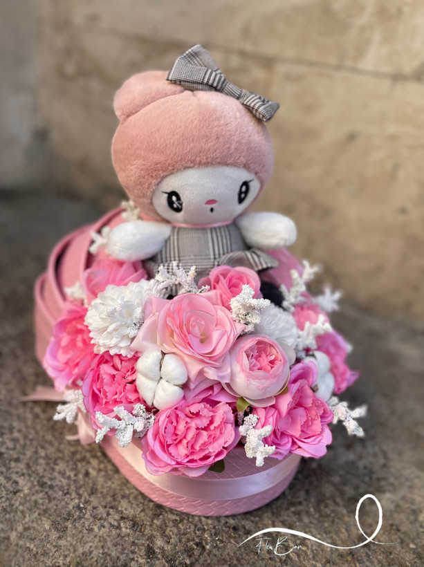 باکس گل گهواره ای نوزادی دخترونه با گل مصنوعی و عروسک فلوبار