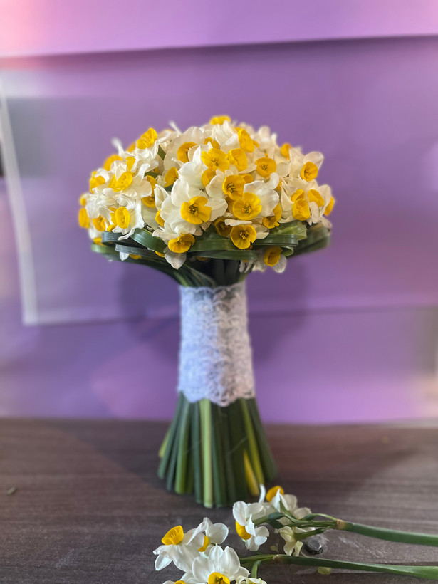 دسته گل عروس با گل نرگس و برگ لیندا💛💚🤍