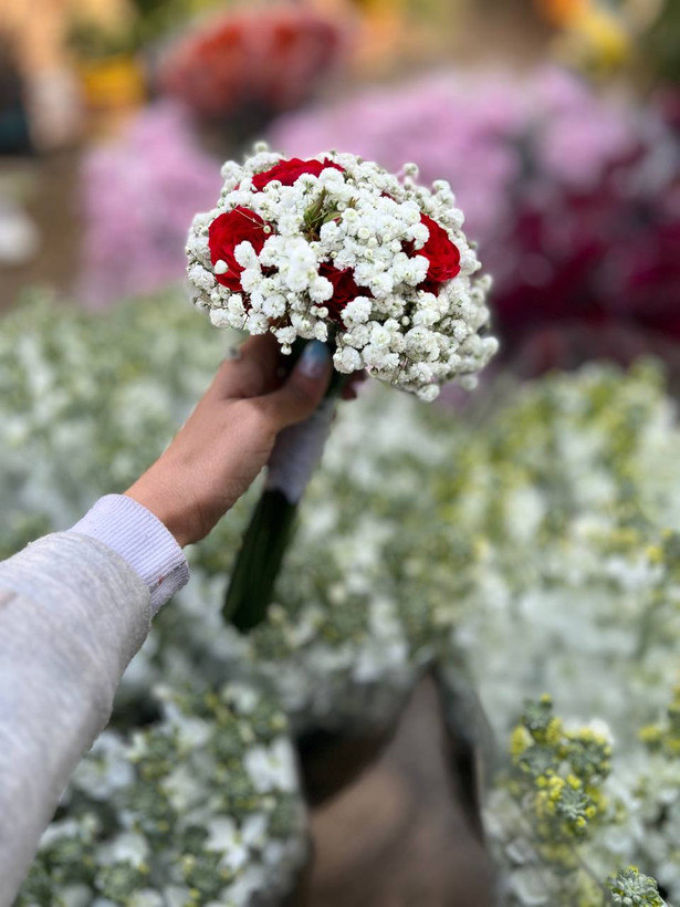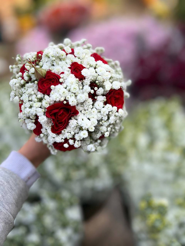 دسته گل عروی با رز مینیاتوری قرمز و ژیپسوفیلا🤍❤️