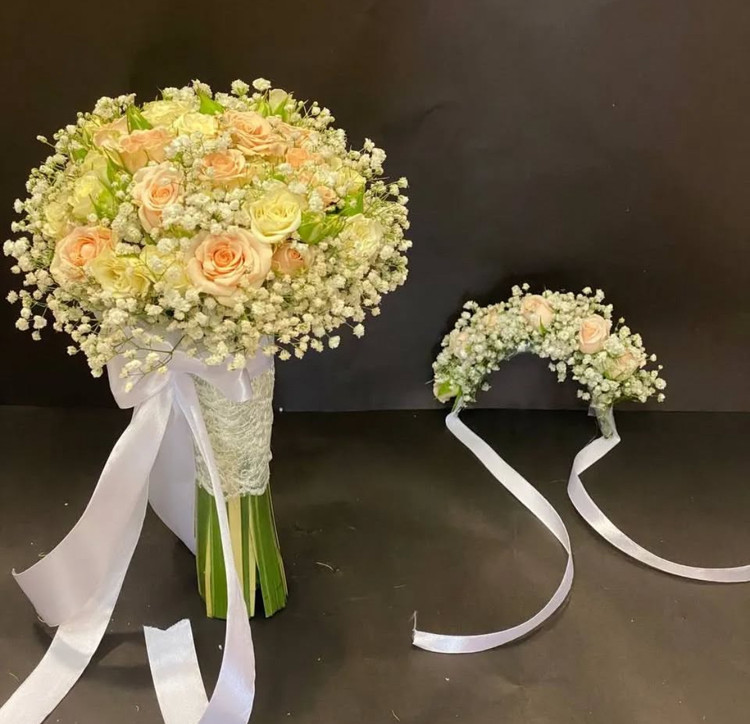دسته گل عروس با رز مینیاتوری سفید و گلبهی و ژیپسوفیلا🤍