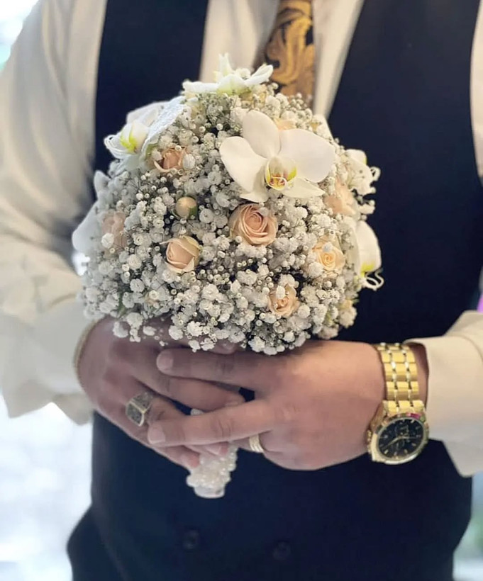 دسته گل عروس با رز مینیاتوری گلبهی، ارکیده و ژیپسوفیلا🤍