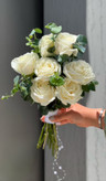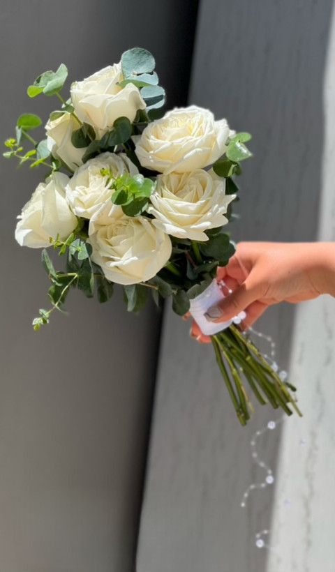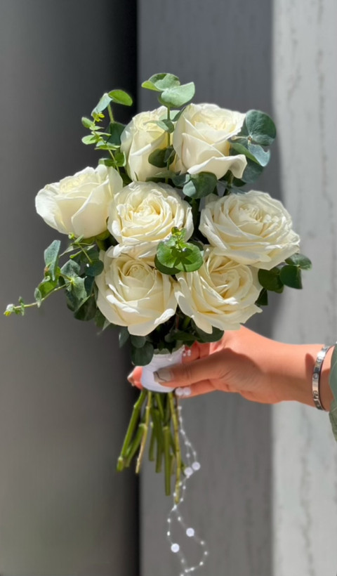 دسته گل دفرمه عروس با گل رز سفید و اکالیپتوس🤍