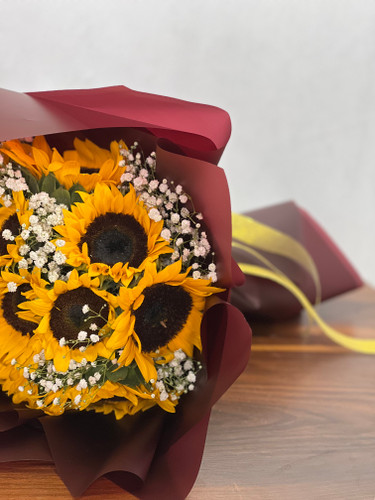 دسته گل آفتابگردون ترکیب با رنگ زرشکی فلوبار