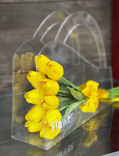 گل لاله مصنوعی زرد داخل فلاوربگ پلکسی فلوبار