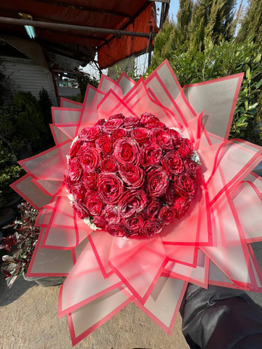 دسته گل ۵۰ شاخه رز قرمز شاین دار یا اکلیلی فلوبار