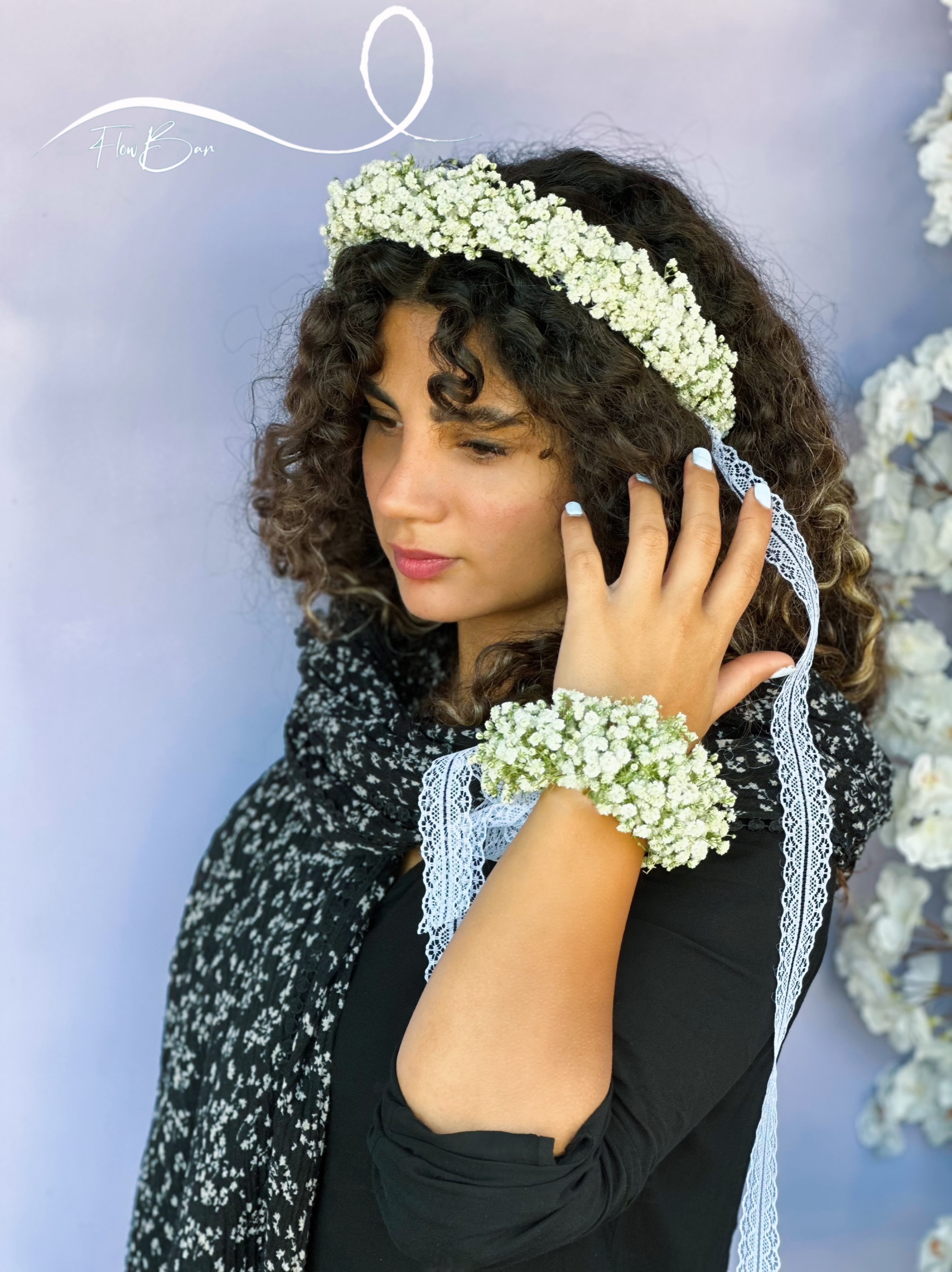 تاج و دستبند عروس با گل طبیعی فلوبار