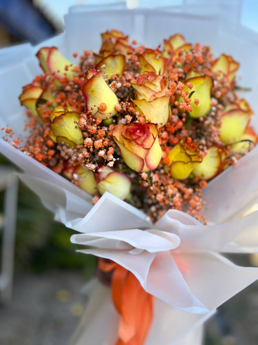 دسته گل یک طرفه رز و ژیپسوفیلا نارنجی فلوبار