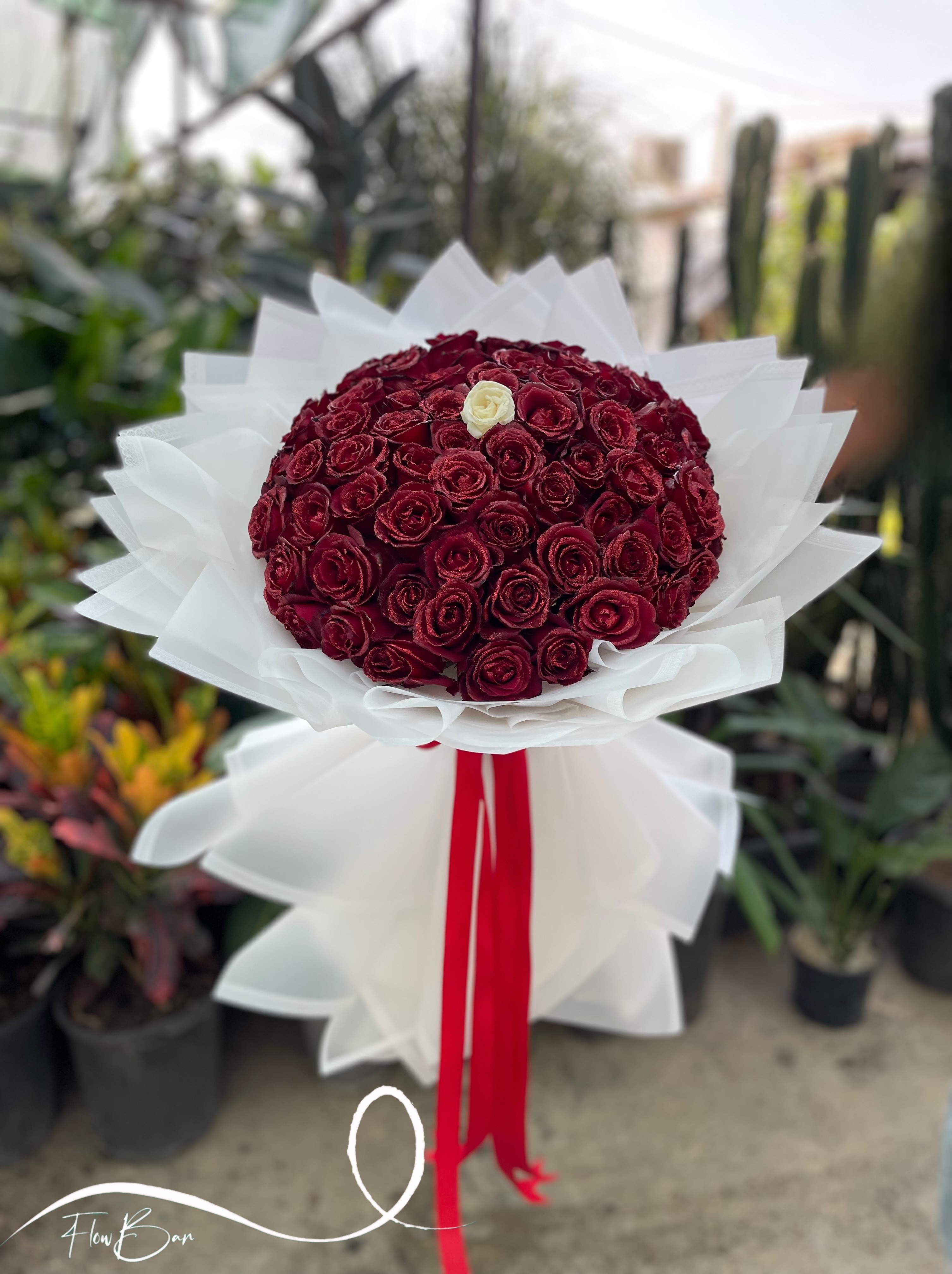 دسته گل ۶۰ شاخه رز قرمز شاین دار فلوبار