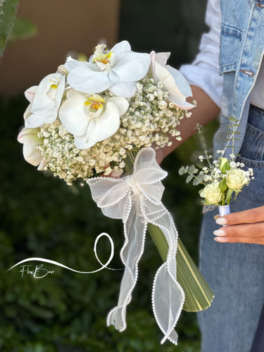 دسته گل عروس سفید با رز و ارکیده فلوبار