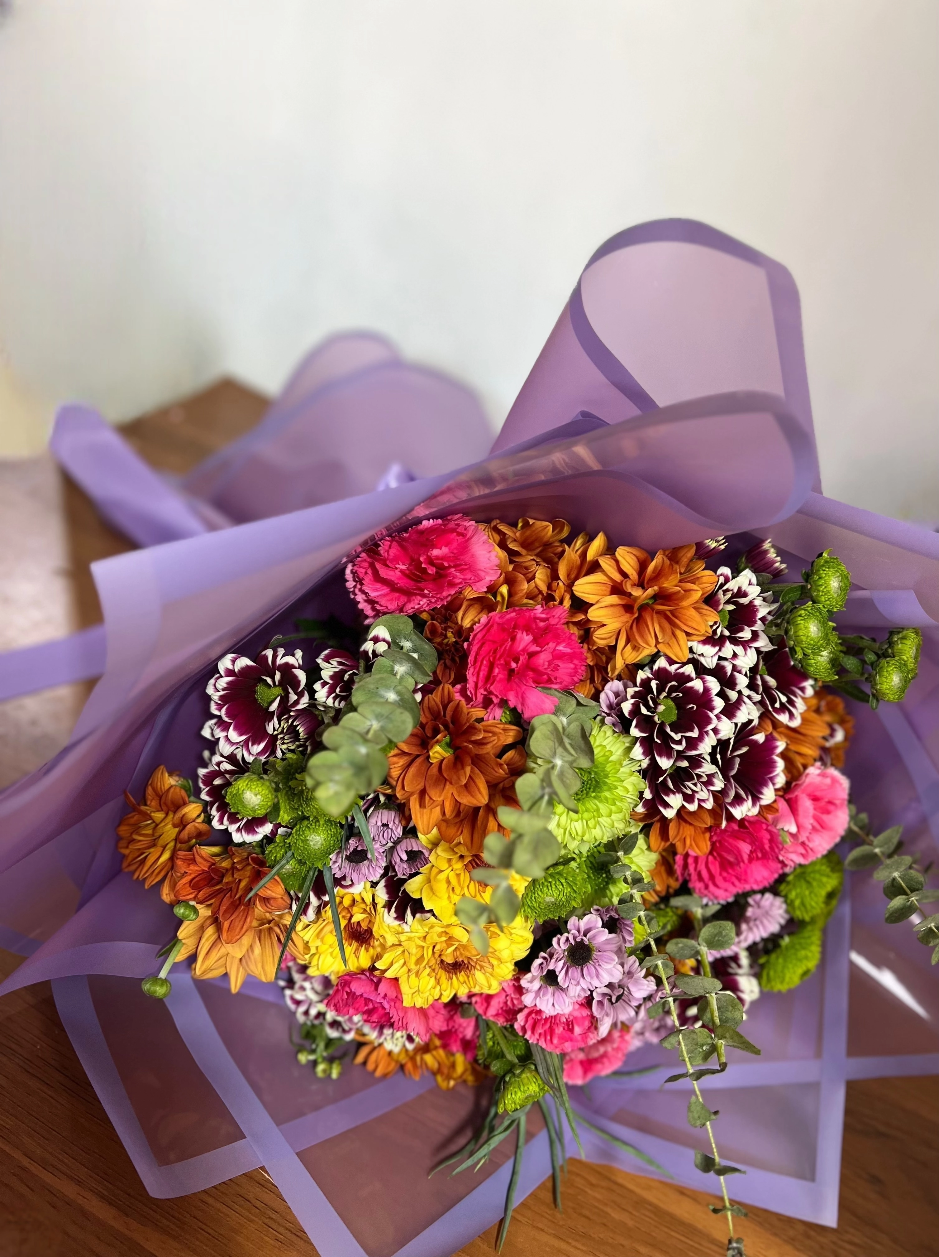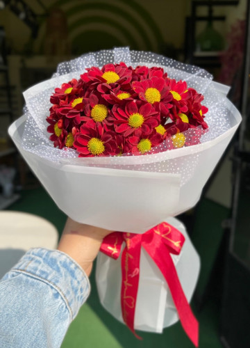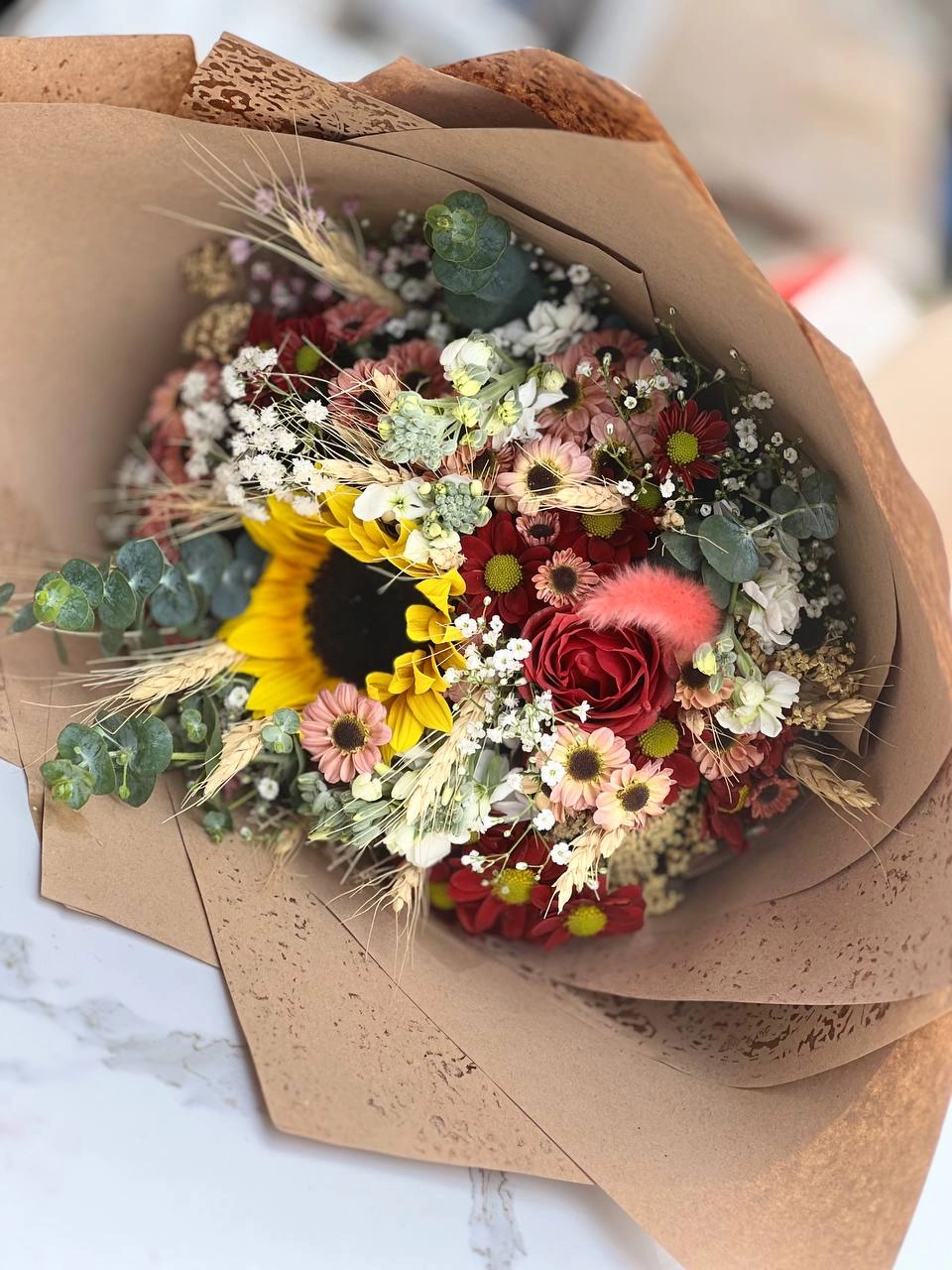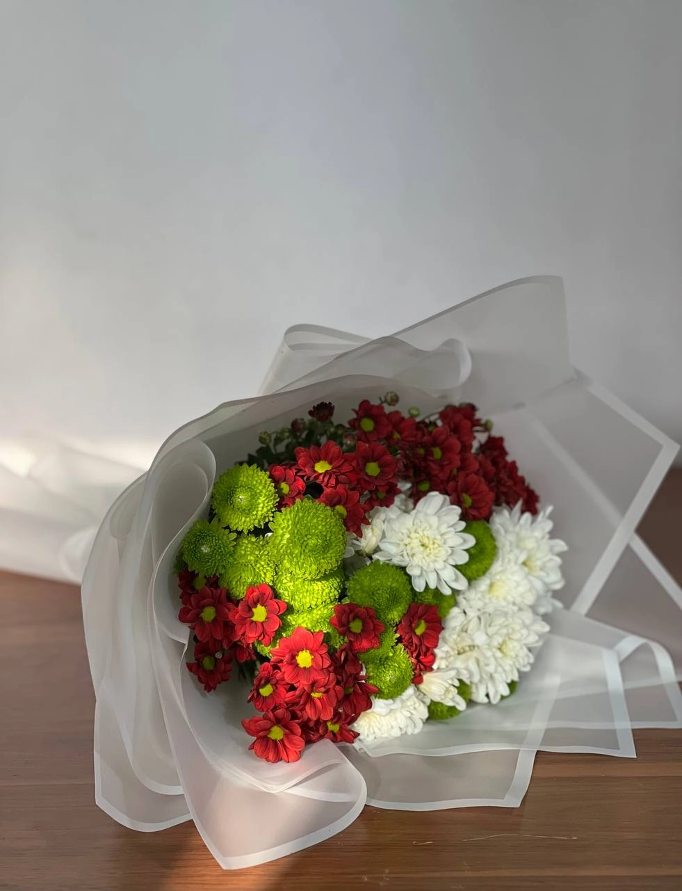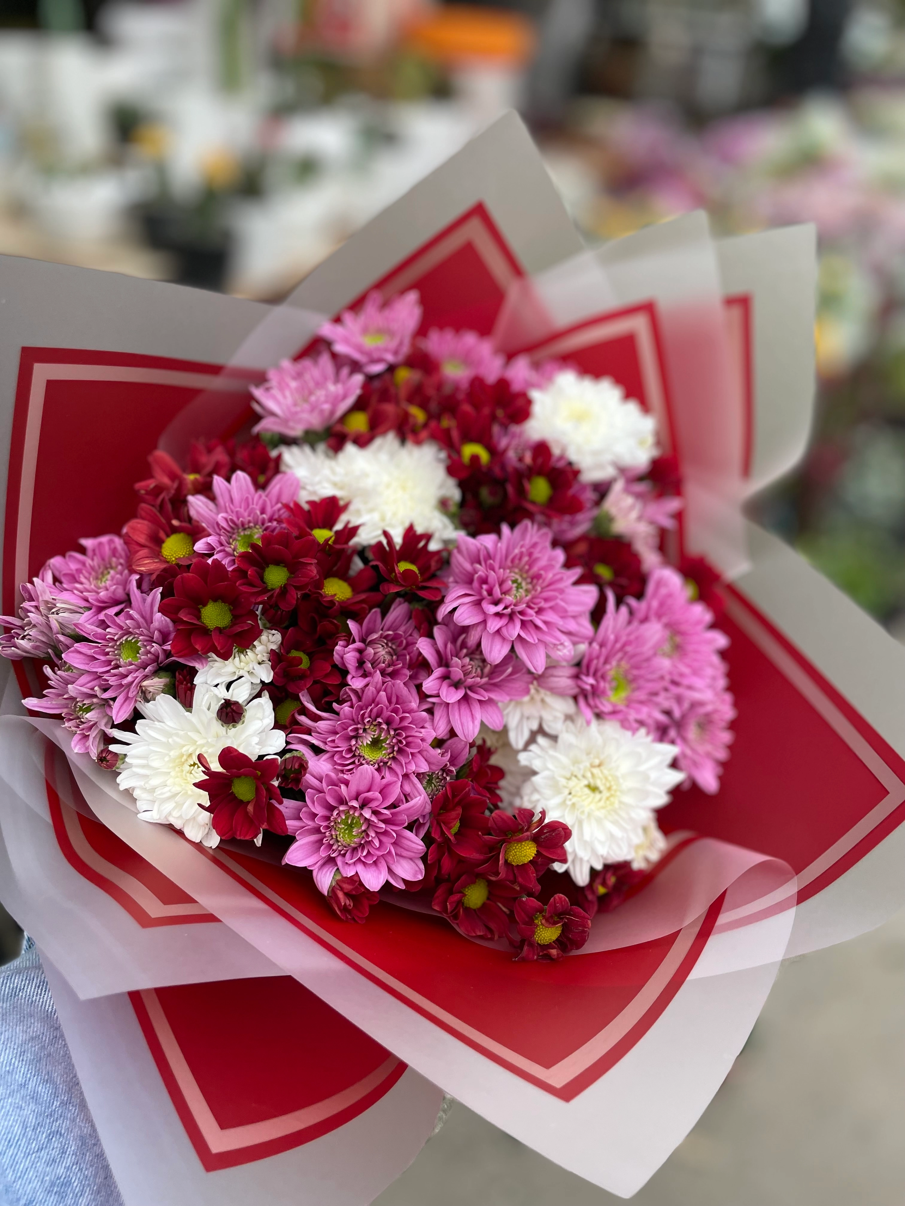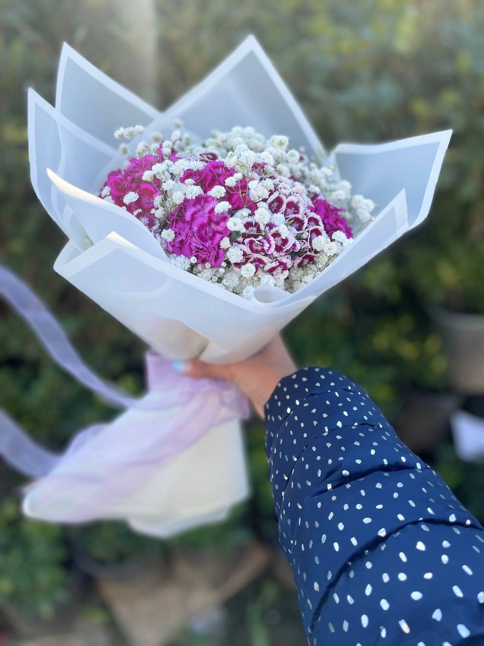 دسته گل رز مینیاتوری و داودی و ژیپسوفیلا فلوبار