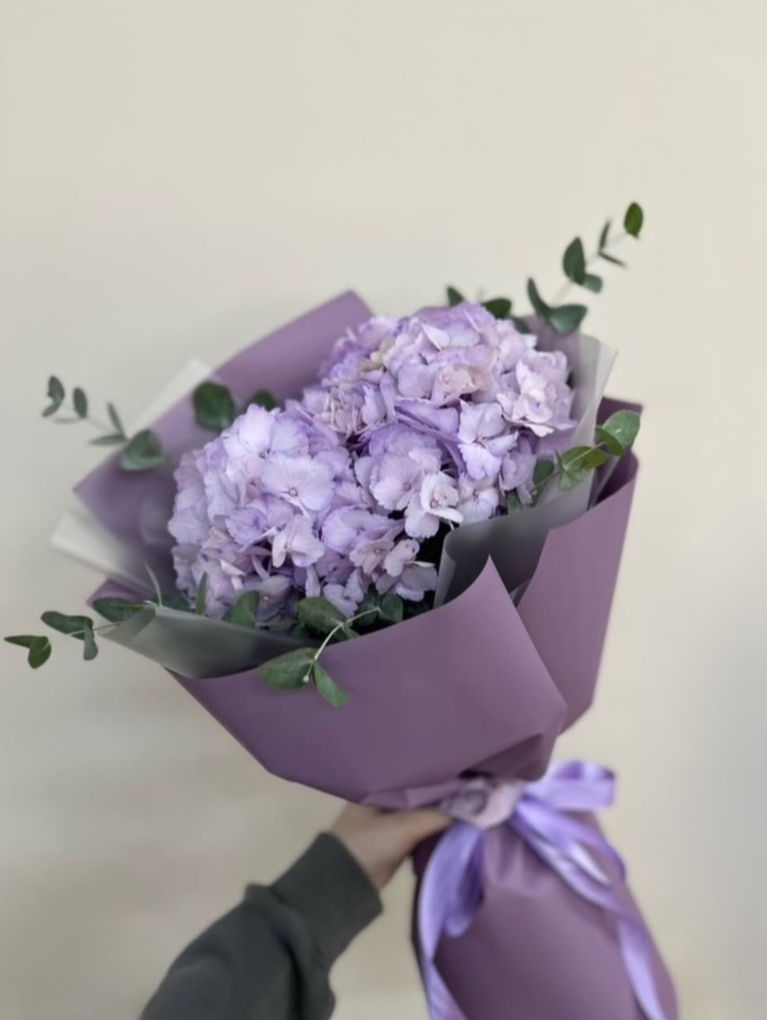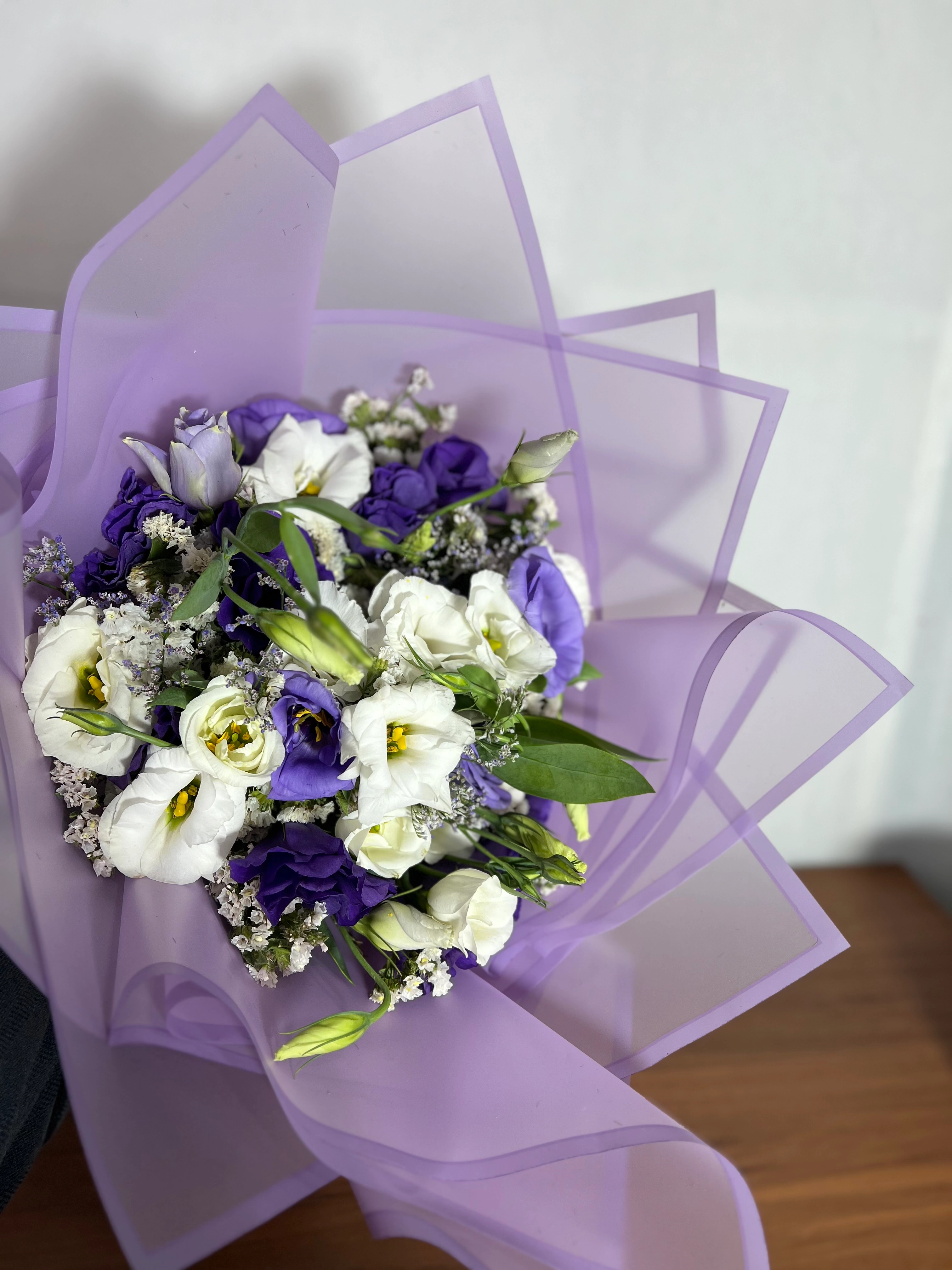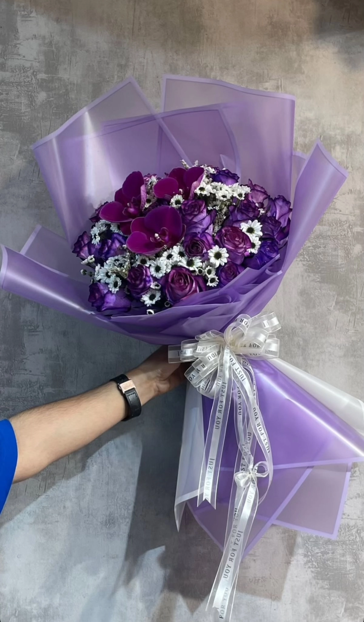 دسته گل رز بنفش و داوی کرزنتیا و ارکیده فلوبار