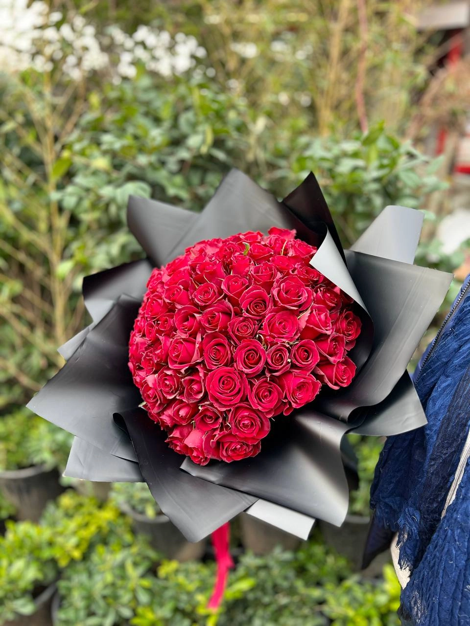 دسته گل ۶۰ شاخه رز قرمز فلوبار