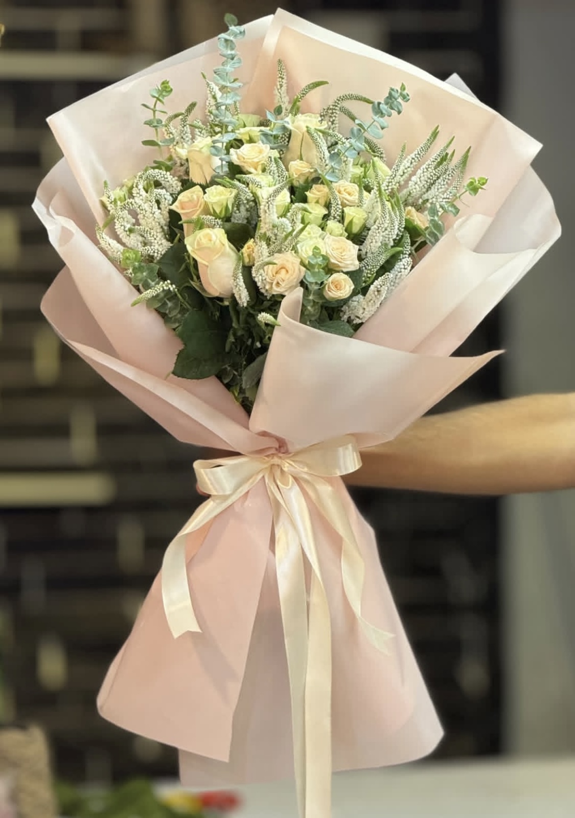 دسته گل ۴۰ شاخه رز سفید فلوبار